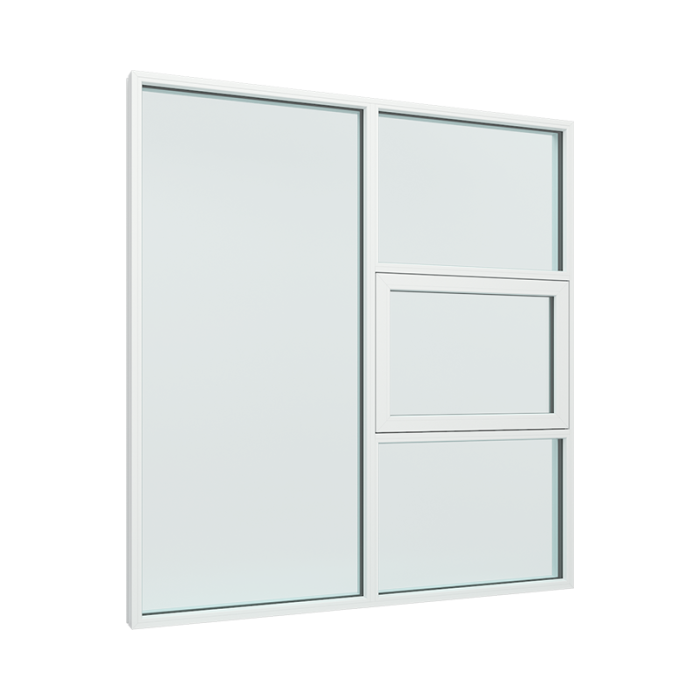 med 1 glassfelt og toppstyrt vindu i midten, samt 1 fag med 1x3 glassfelt (PVC-U2-11-TM-13)