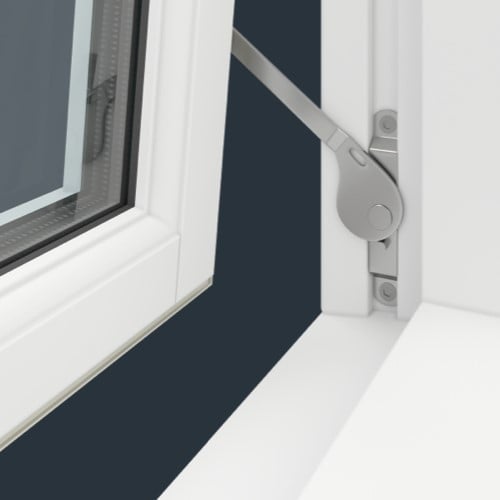 Slik virker sikringen: 1. Vinduet åpnes til sikkerhetsarmen kobles inn. 2. Vinduet lukkes igjen cirka 2 cm. 3. Sikkerhetsarmen hektes fri av kroken mens du åpner vinduet. 4. Når vinduet stenges, vil sikkerhetsarmen automatisk kobles inn igjen, neste gang vinduet åpnes.