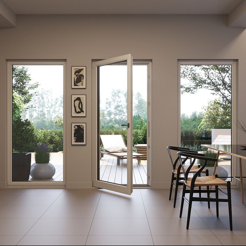 Ved de fleste vinduer og dører kan du velge mellom furu, tre/aluminium eller PVC. Herunder kan du se hvilket materiale denne modell tilbys i.