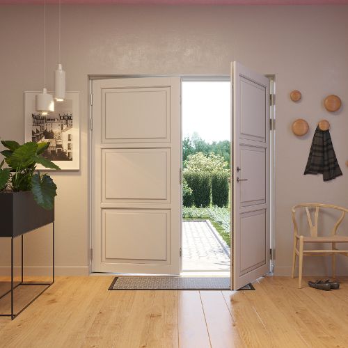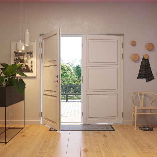 Vær oppmerksom ved innad slående dobbeltdører Når du skal velge åpningsretning på dobbeltdøren din, er det veldig viktig å kontrollere om døren kan risikere å bli utsatt for slagregn og forhold med blest uten le. Konstruksjonsmessig kan innad slående dobbeltdører nemlig ikke sikres 100 % mot vanninntak ved værforhold som eksempelvis slagregn. For å sikre en optimal lukketetthet skal 3-punktslåsen være aktivert og vi anbefaler alltid utadslående dører hvis døren ikke er i le. Det gis derfor ikke garanti mot vanninntak ved forhold som nevnt over. Det er normalt at Bransjen tar forbehold mot dette, men vi har valgt å gjøre dette forbehold mer synlig sånn at de som kan velge utadslående dører, også velger utadslående dører innen de kjøper døren.
