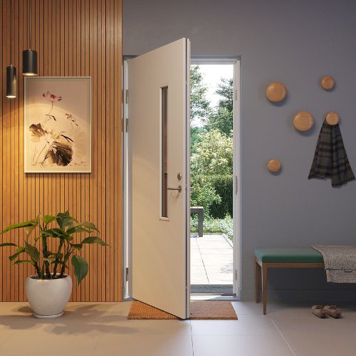 Merk: På en innad slående dør vil det ikke være frest ut not til foring, men det sendes istedenfor med notlister som klikkes på karmen