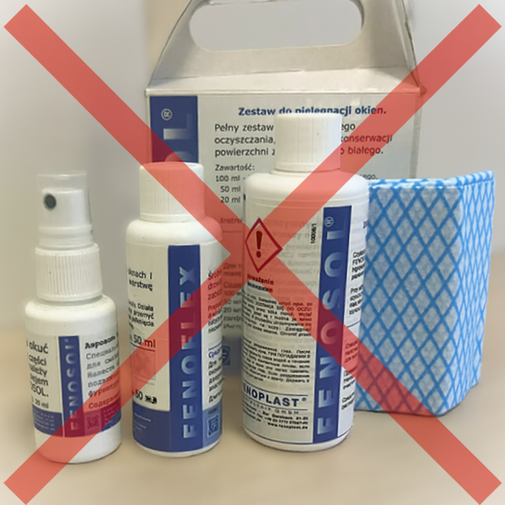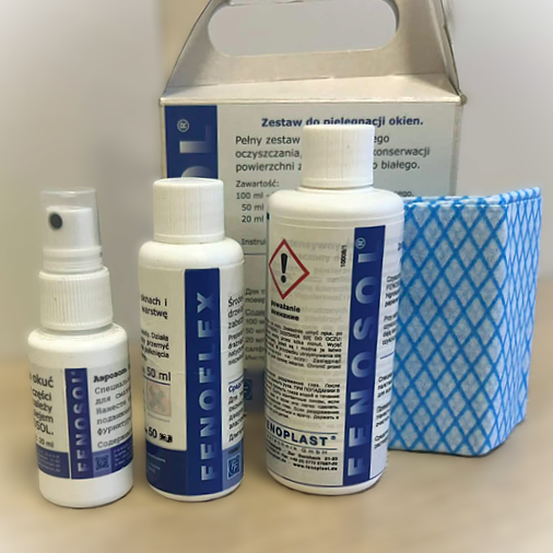 Her kan du velge å legge til et rengjøringssett. Settet fra FENOSOL er til intensiv rengjøring, pleie og vedlikehold av hvite PVC-overflater. Settet inneholder: 1. Rengjøringsmelk for rengjøring av hvit PVC (100 ml) – for intensiv rengjøring av PVC-vinduer, dører og rulleskodder; 2. Olje for pleie og vedlikehold av beslag (20 ml) – sikrer riktig funksjon av beslagene, etterlater en beskyttende hinne og forhindrer støyende drift; 3. Væske for rengjøring av pakninger (50 ml) – hindrer pakninger i å klebe seg sammen og fryse fast om vinteren; 4. Myk klut og bruksanvisning