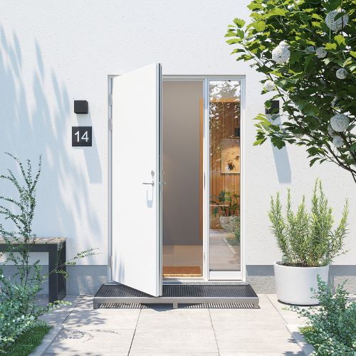 Da døren leveres med ekstra låsepunkter (3 punkt lås) er det ikke alle elektriske låsesystemer som kan monteres på dørene våre. Dette er fordi håndtaket skal løftes opp for å aktivere de ekstra låsepunkter, før døren kan låses. Viktig information om Yale Doorman! Døren skal være minst 196 cm høy for at det kan monteres Yale Doorman. Yale Doorman er 3-punkts lås med tastatur, 1 nøkkelbrikke, 1 hub/bridge (2,4 Ghz) – Du kan åpne døren med kode, nøkkelbrikke eller app.