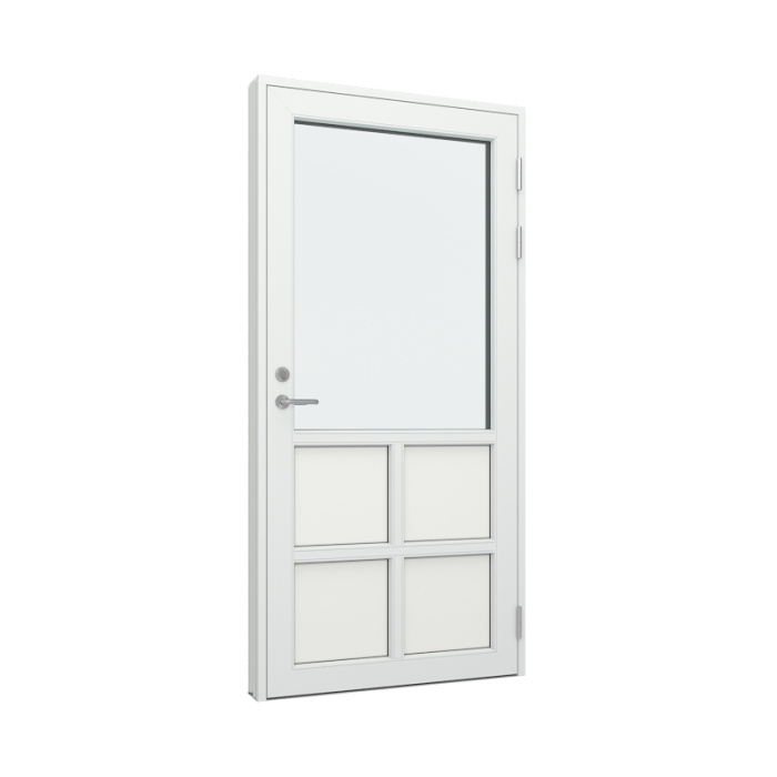 Våre fyllinger på tre/alu dører tilbys kun med moderne profil utvendig, men du kan velge om den innvendig skal være klassisk eller moderne. Ønsker du å justere brystningshøyden kan du selv justere høyden i valget for 'Karmmål'.