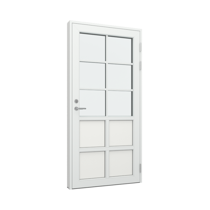 Våre fyllinger på tre/alu dører tilbys kun med moderne profil utvendig, men du kan velge om den innvendig skal være klassisk eller moderne. Ønsker du å justere brystningshøyden kan du selv justere høyden i valget for 'Karmmål'.